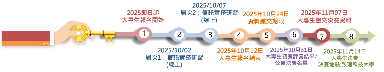 目的:為普及所有國人的基礎信託理財知能,針對大專生辦理信託規劃競賽。透過信託實務研習,讓學生對信託應用方式有基本的瞭解,並藉由信託案例規劃瞭解這項理財工具的應用情境,以落實信託知識普及之成效,達成普惠金融之目標。