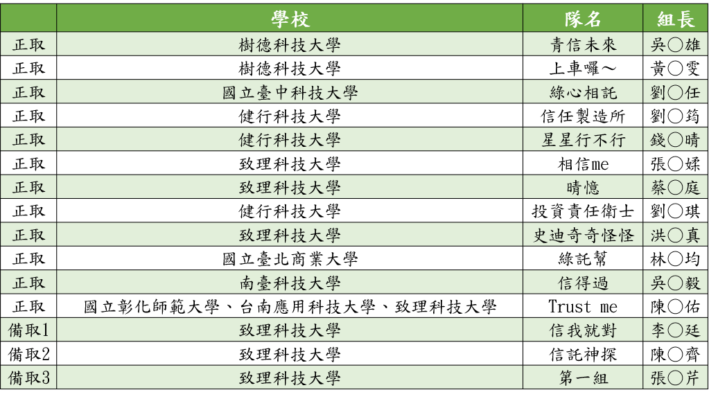 目的:為普及所有國人的基礎信託理財知能,針對大專生辦理信託規劃競賽。透過信託實務研習,讓學生對信託應用方式有基本的瞭解,並藉由信託案例規劃瞭解這項理財工具的應用情境,以落實信託知識普及之成效,達成普惠金融之目標。